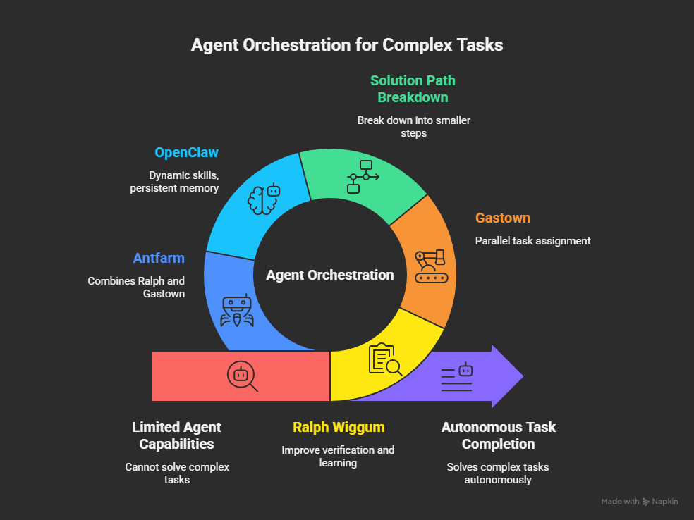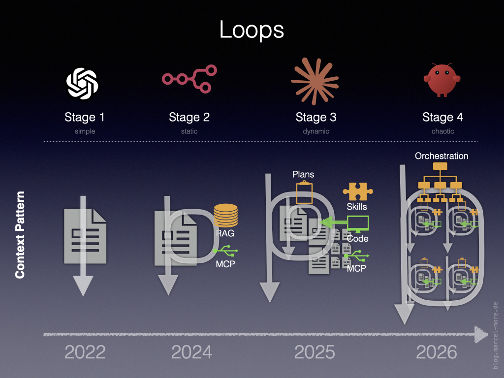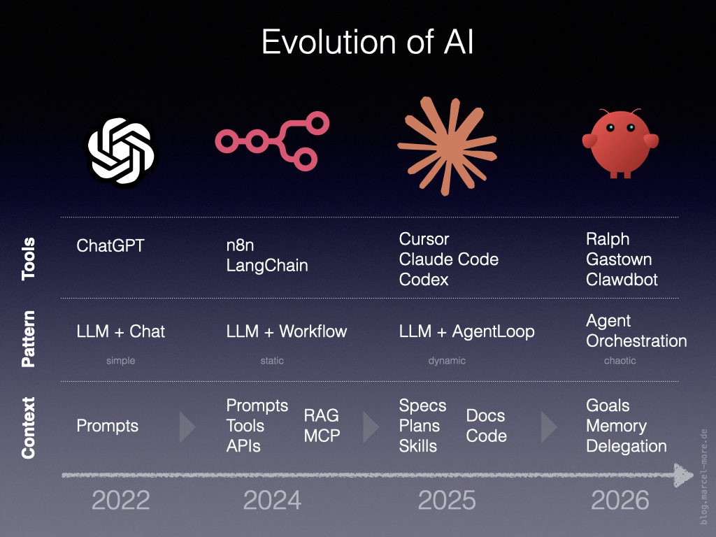 Marcel hasn’t just written an article; he has authored the Contemporary History of AI Development. In the following piece, Marcel maps the evolution from simple AI Chat to the complex Agent Orchestration loops (Phase 4) that define our current era. He provides the “Lighthouse” for those of us navigating the shift toward “Ralph Loops” and “Antfarms”—frameworks designed to turn multi-agent chaos into deterministic results.