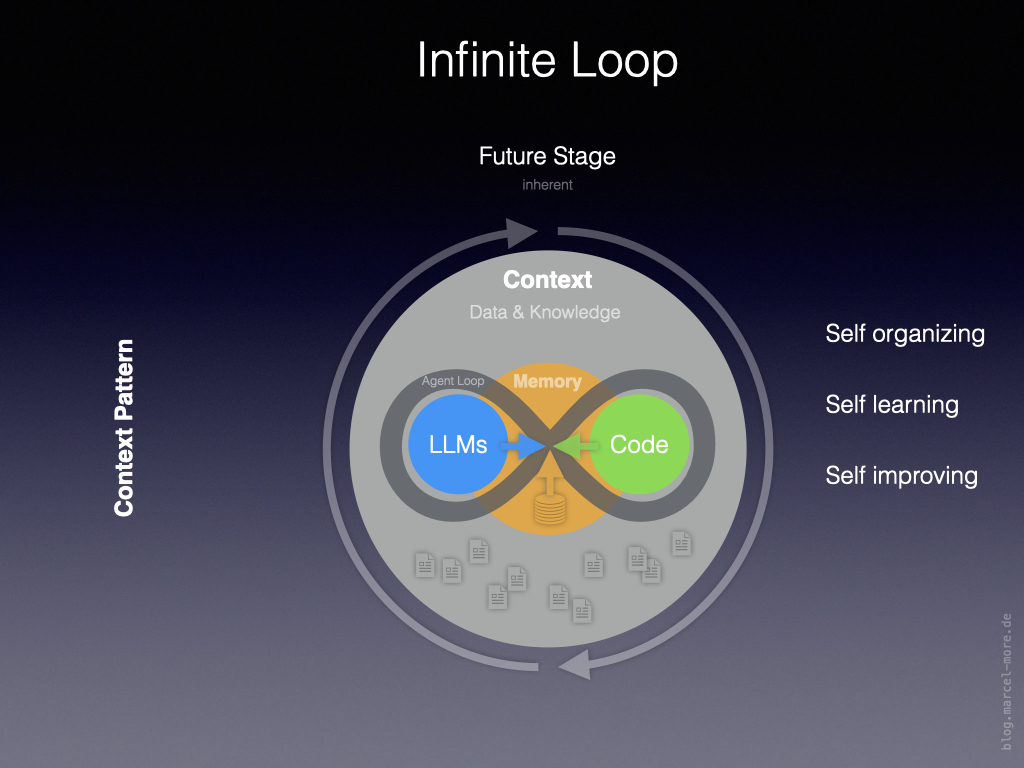 This brings us closer to a structure that inherently combines all these ingredients. When instructions, knowledge, memory, and solution strategies all become part of the same context set, there is a chance that this system will organize itself, learn, and potentially gain new insights with each additional loop.
