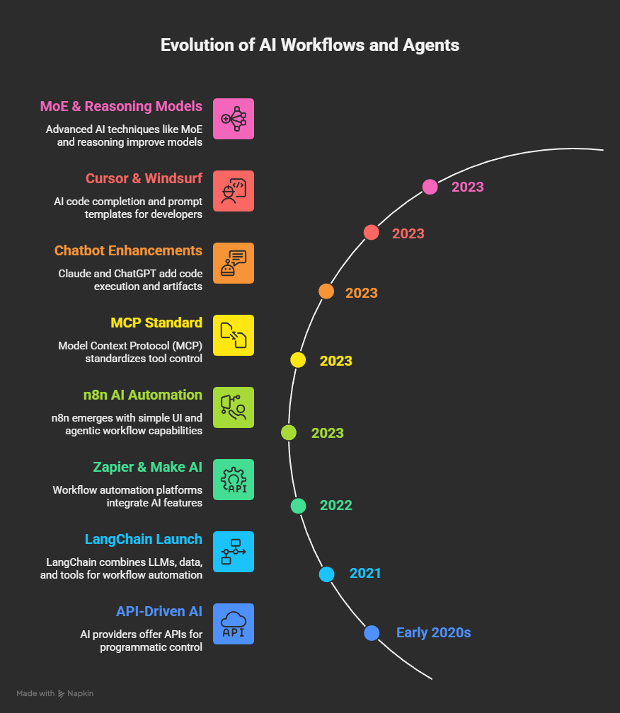 Claude and ChatGPT expanded their chatbots with features such as “Advanced Data Analysis”, “Code Interpreter”, “Canvas” and “Artifacts”. These are capable of generating and executing code in a separate area within the chat window. The output goes beyond pure text responses; instead, real results are displayed. This also brought workflow features and code more into focus. Direct tool interfaces and MCP were added later.