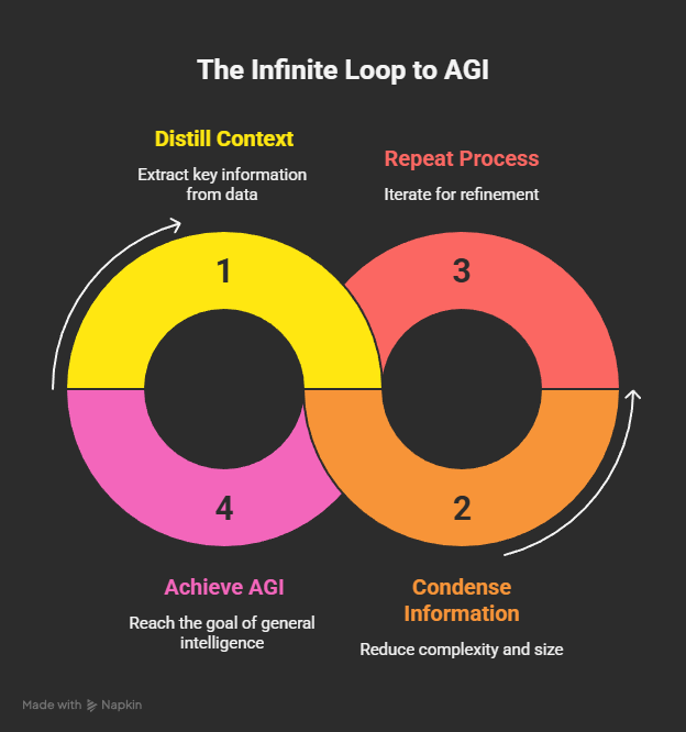 Perhaps it is an infinite loop that leads us to general artificial intelligence (AGI)? An infinite stream of context that is distilled and condensed in infinite repetitions until the result is achieved.