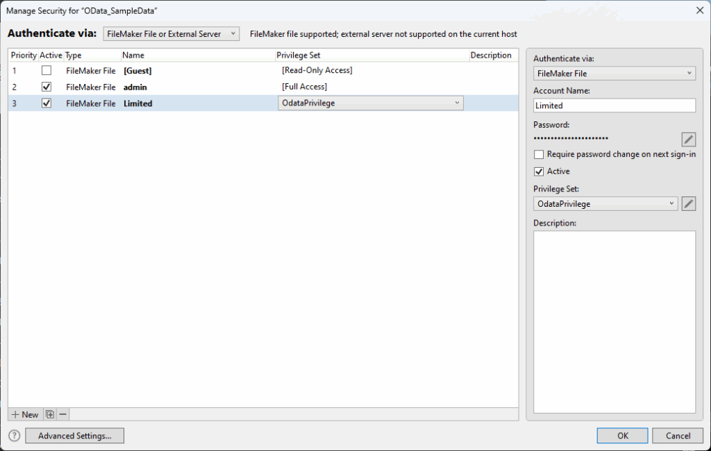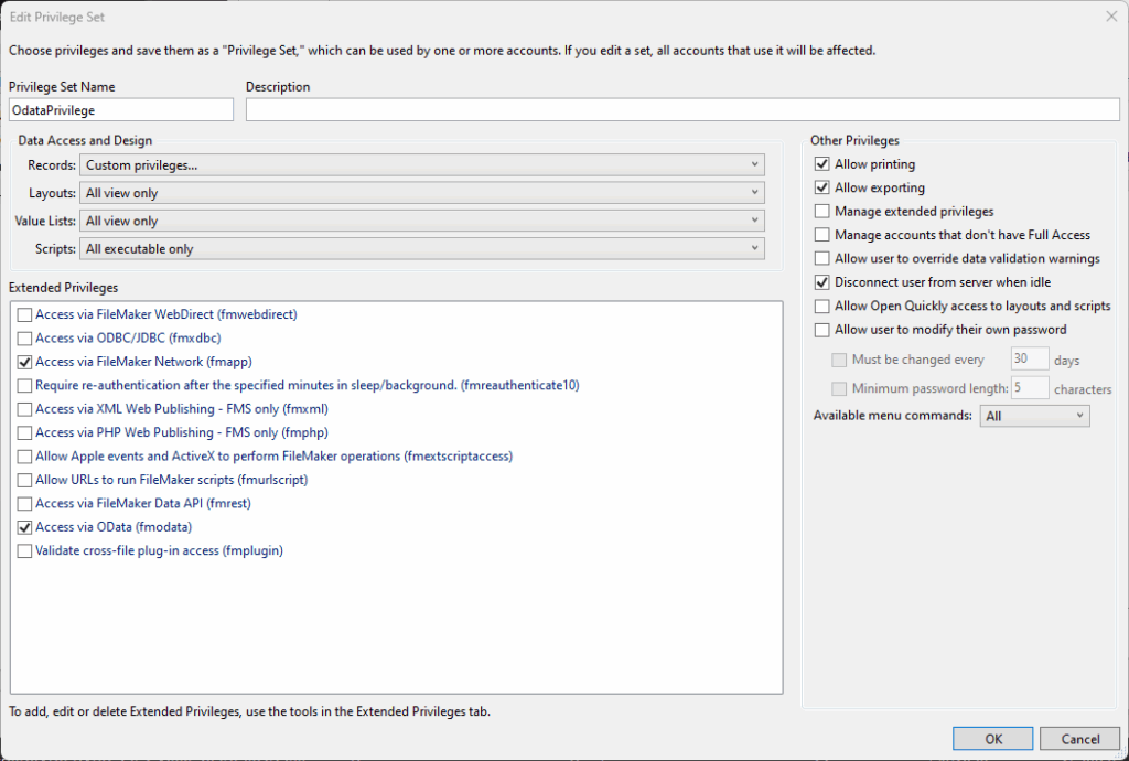 OData exposure is strictly privilege-based and context-independent. Unlike Data API or Custom Web Publishing, there is no “layout” context or field mapping layer—what the privilege set can see, OData can see. Nothing more, nothing less.