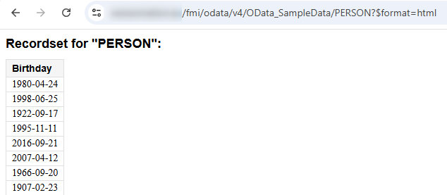 https://<server>/fmi/odata/v4/<ServiceName>/<TableName>- By default, returns a human-friendly HTML page. Good for testing, useless for code.