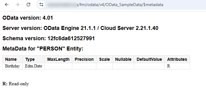| Metadata | https://<server>/fmi/odata/v4/<ServiceName>/$metadata?$format=json |