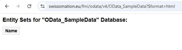 | Entity Sets /fmi/odata/v4/ServiceName/YourTable | HTML | ?$format=json | ?$format=xml |