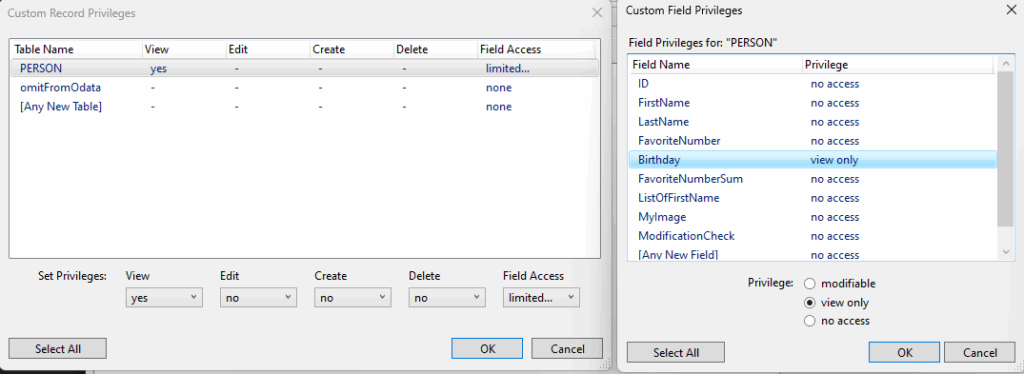- If Field Access is set to none (or all fields are “no access”), OData will not expose any data/columns for that table—effectively the same as hiding the table.
