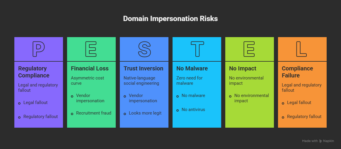 For a European company, owning only a .com domain while not controlling the corresponding .eu and .localCountry domains is not a minor oversight. It is a structural cybersecurity weakness that dramatically reduces attacker cost, increases attack success rates, and amplifies legal and reputational fallout.